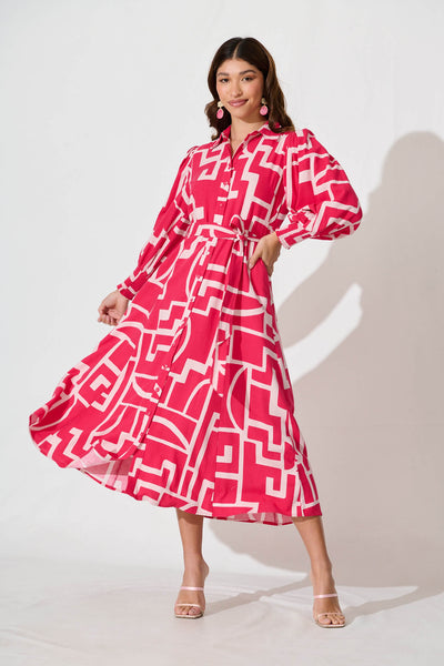 Wiltshire Maxi Dress In Pink With Pink Print Linen Blend