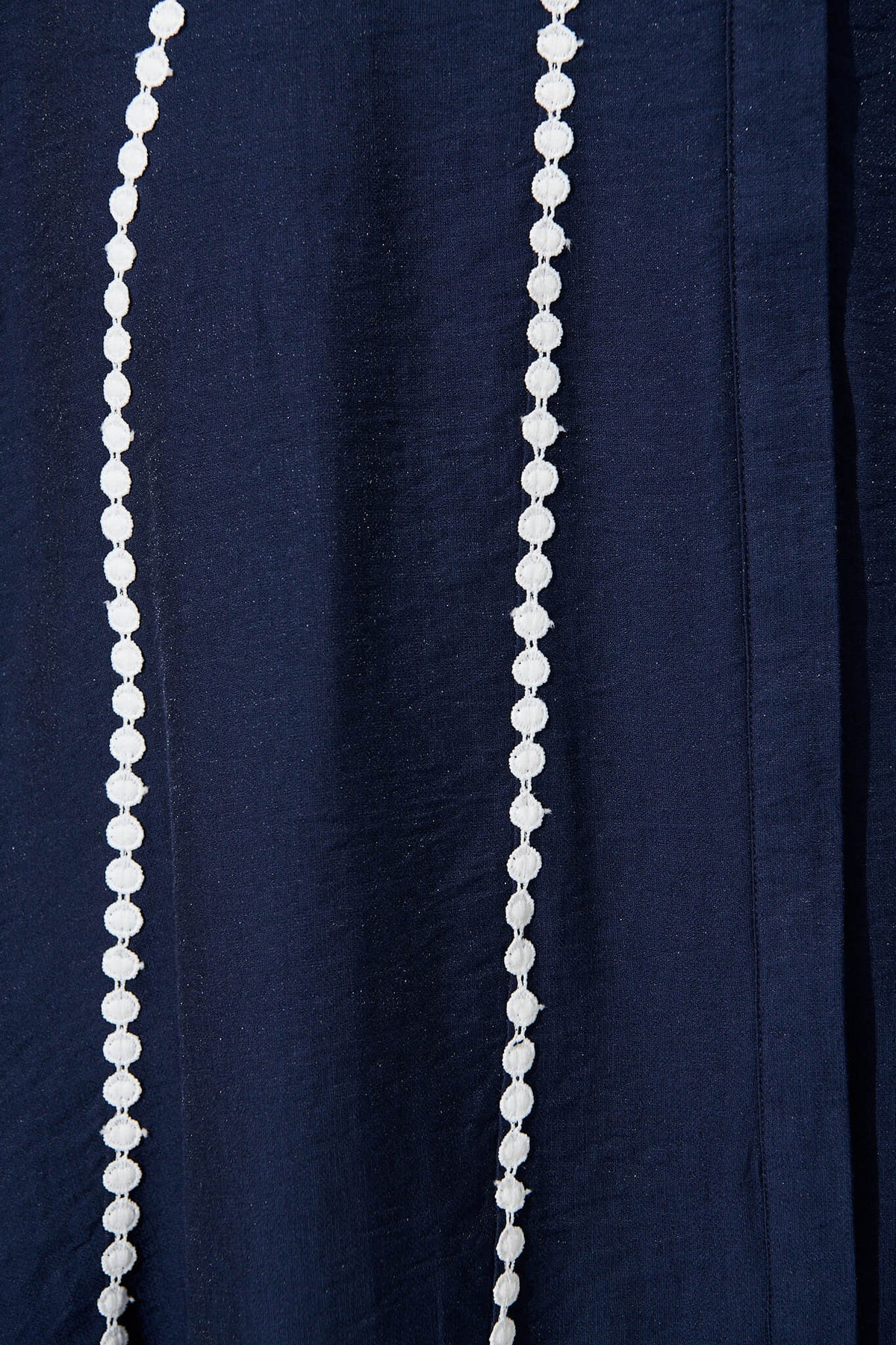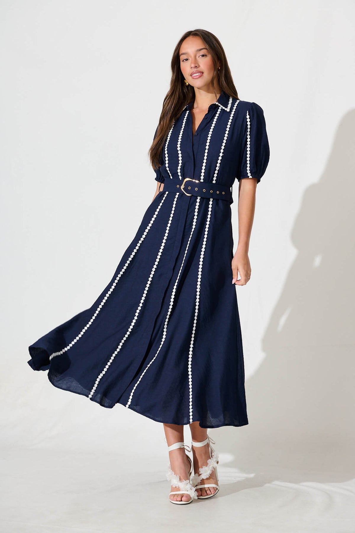 Our Adore Maxi Shirt Dress in Navy is a sophisticated sea breeze. Its lightweight fabric and flowing silhouette make it perfect for a warmer season evening out. The gold buckle and lace details add a touch of elegance, while the hidden placket keeps it sleek and modern. It's like a stylish anchor for your wardrobe!