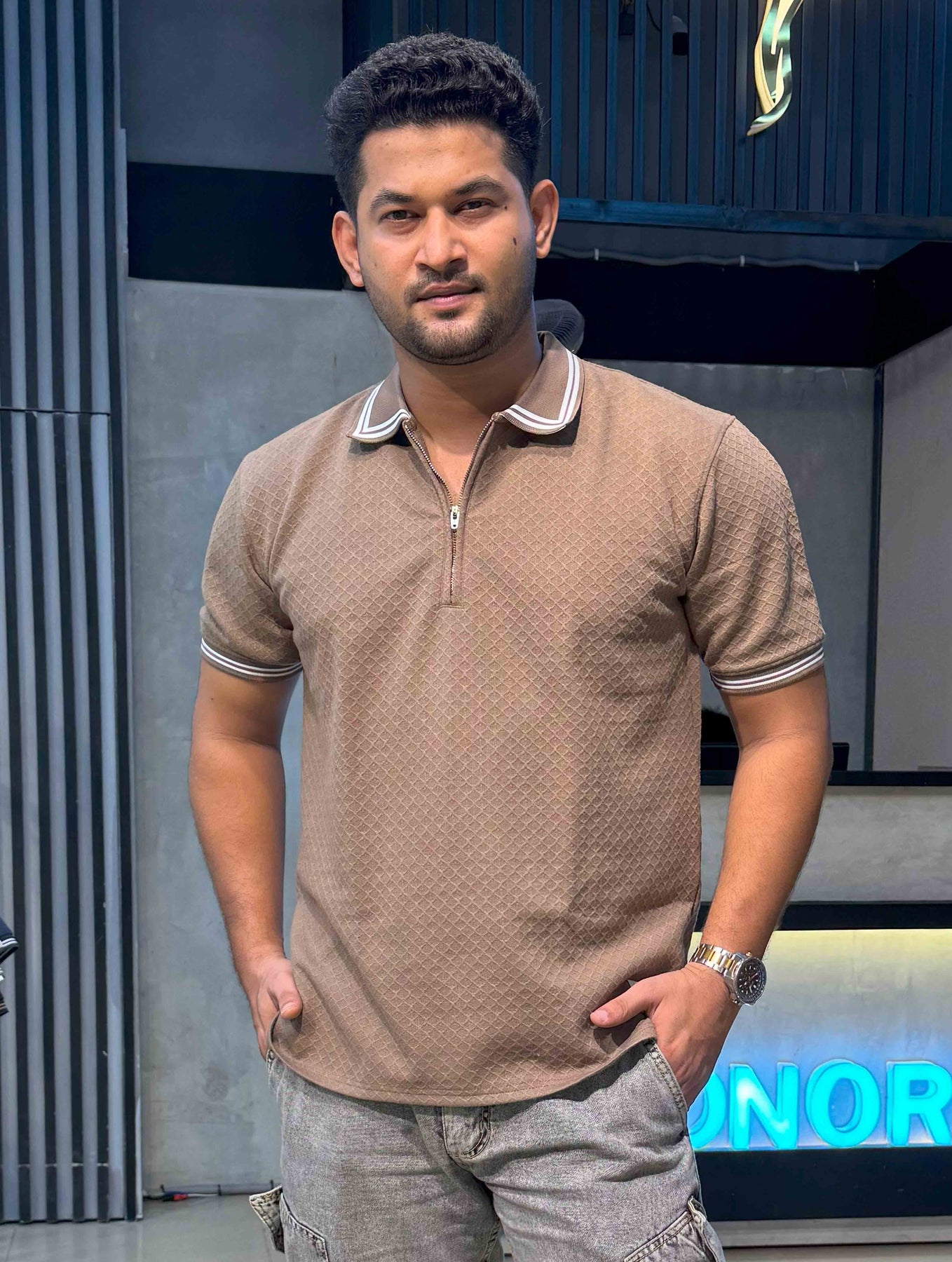Caramel Brown stripe contrast Premium Zipper Polo