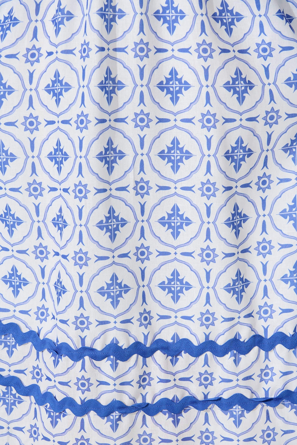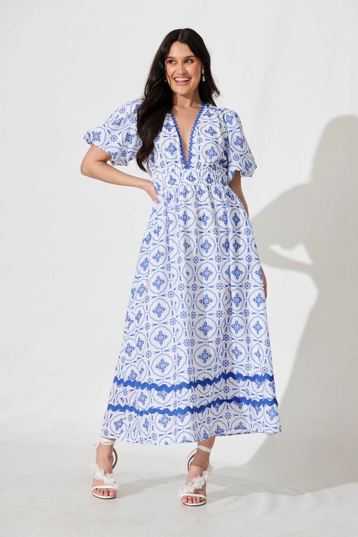 Indi Maxi Dress in White with Blue Tile Linen Blend