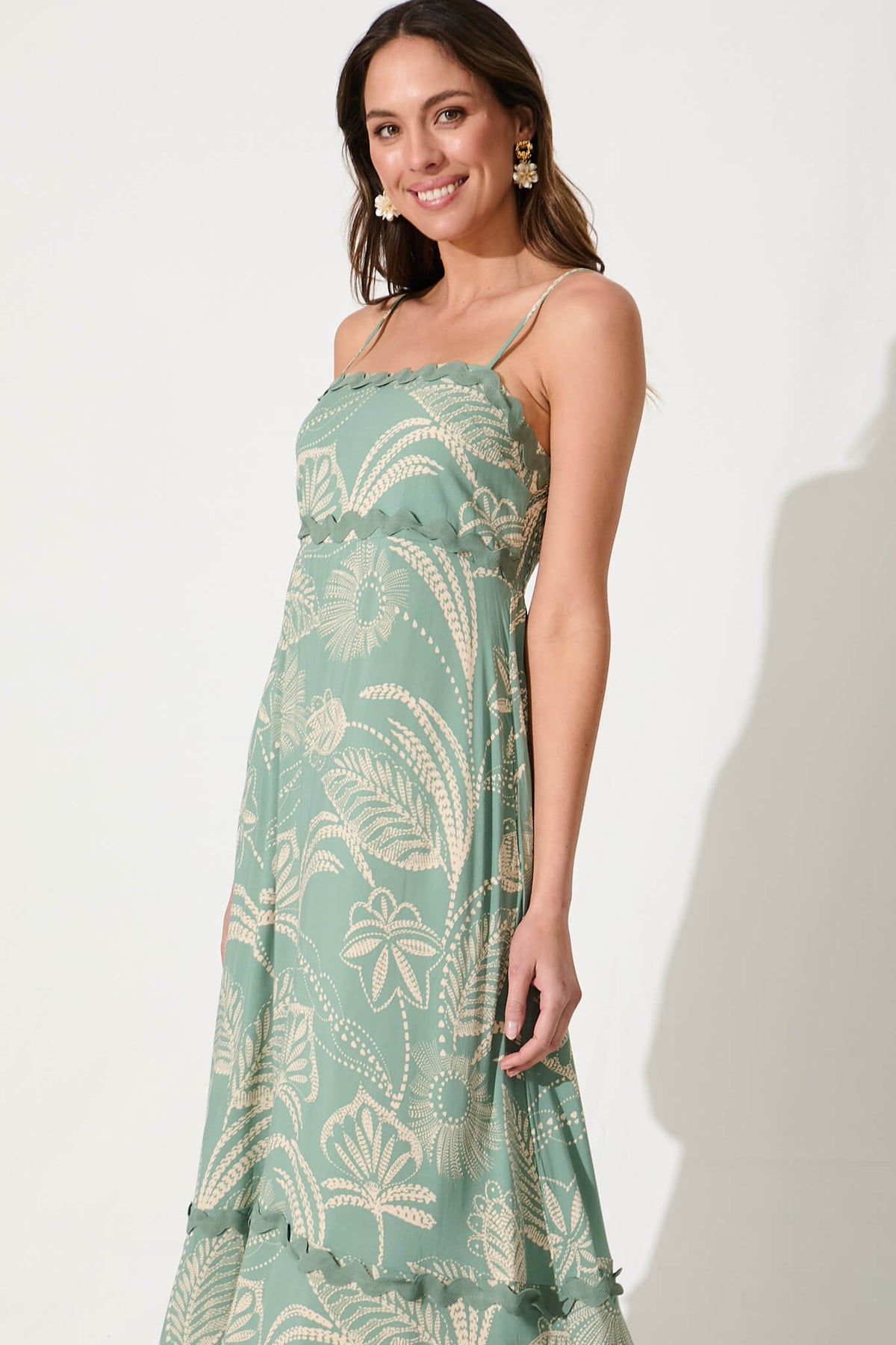 Treviso Maxi Sundress In Green And Cream With Ric Rac Trim
